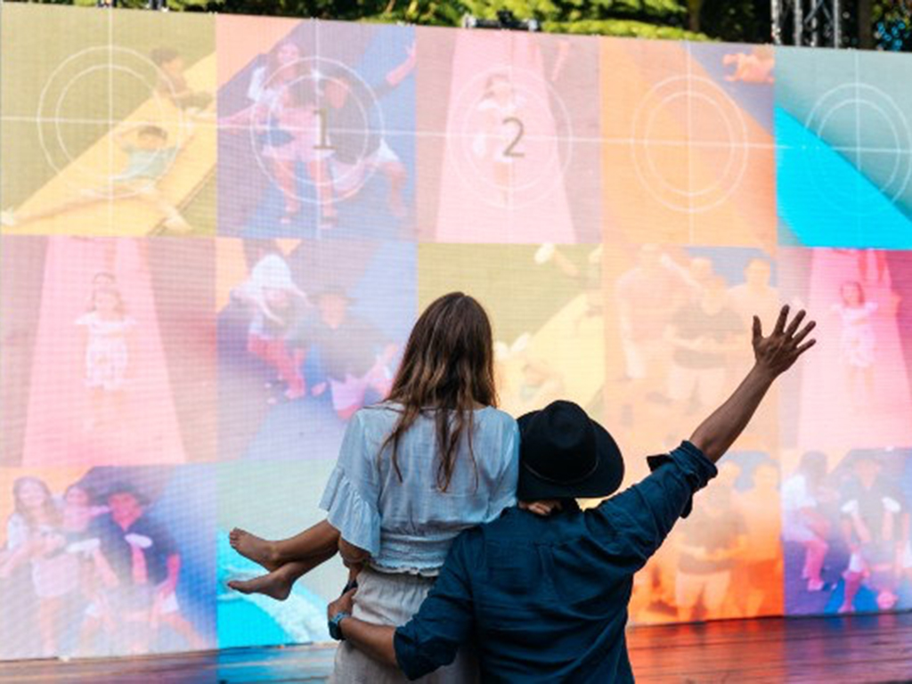 Transforming both the environment and human behaviour through the creative possibilities of playmaking, Colour Me Beautiful transforms public spaces into participatory playful places. The interactive installation captures images of audience members on five runways; live posting them onto a large colour matrix screen – colouring you beautiful.