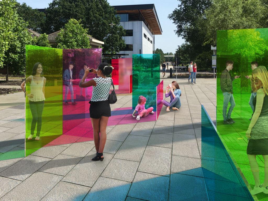 Tine (Bech Studio) has been commissioned to create a permanent display for the University of Warwick’s Art Collection. Shine Your Colours is a large-scale installation designed with coloured glass panels and surveillance two-way mirrors. This multifaceted artwork will invite people to see themselves and the world through reflections and windows of different colours, and to become part of this atmosphere through play, socialising and interactions.